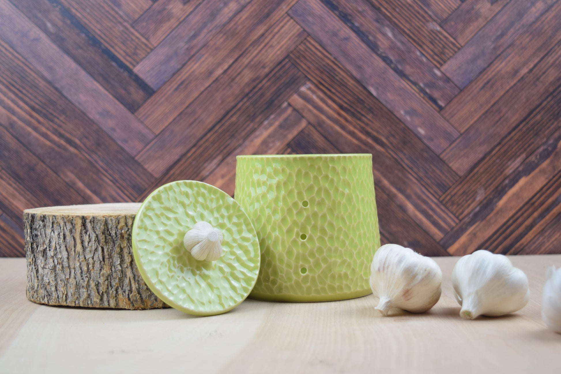 The perfect stylish garlic keeper. Hand carved jar topped with a sculpted garlic head. This jar is ventilated to keep your garlic fresh.