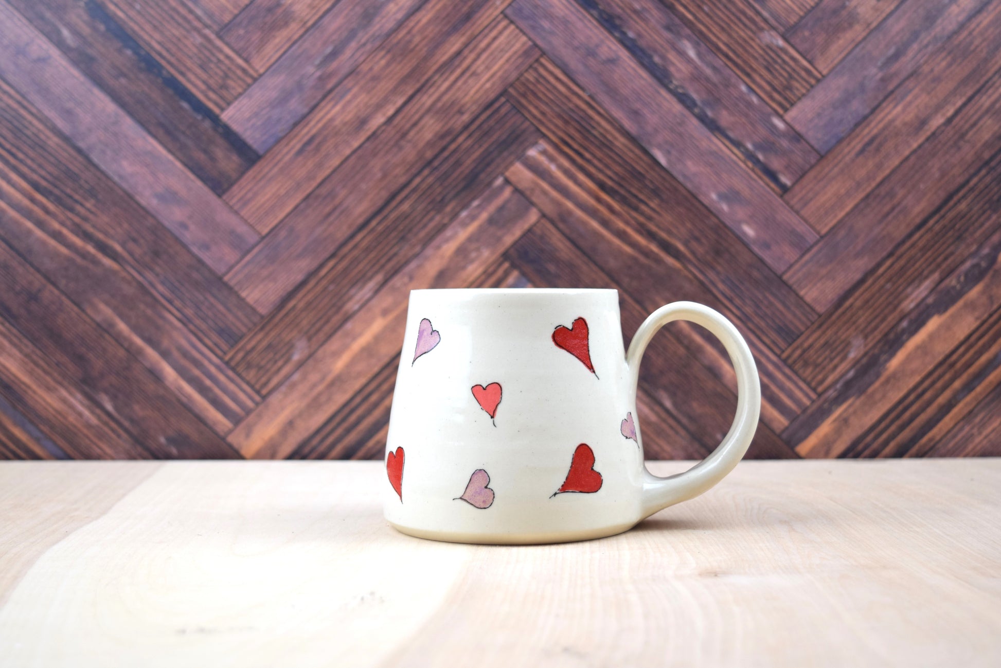 This mug holds approximately 16 ounces and is covered in hand painted hearts and glazed clear.