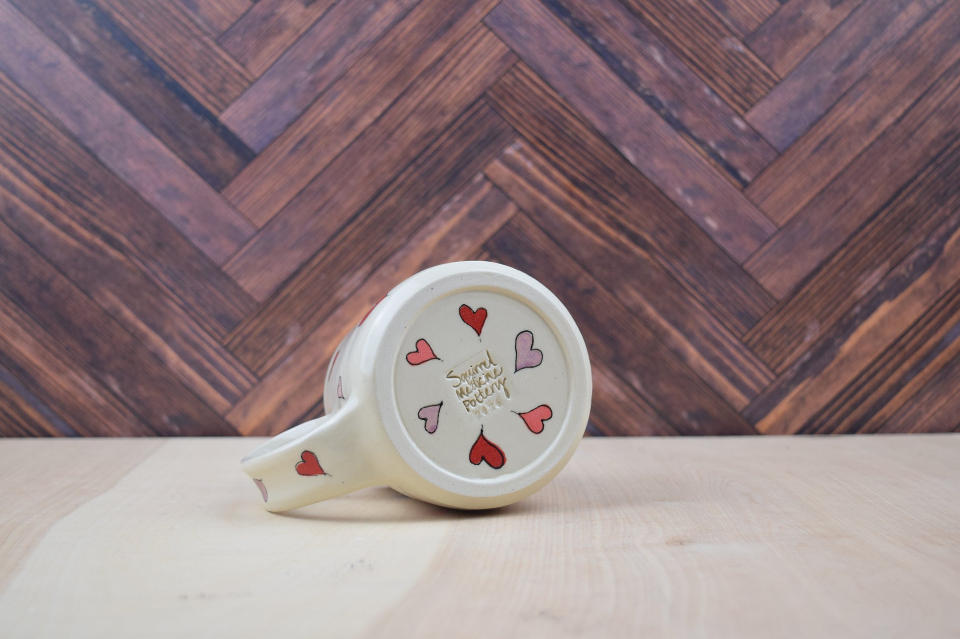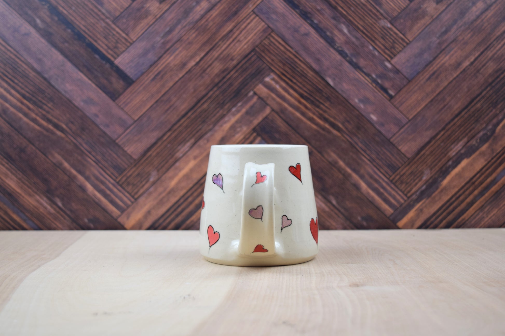 This mug holds approximately 16 ounces and is covered in hand painted hearts and glazed clear.