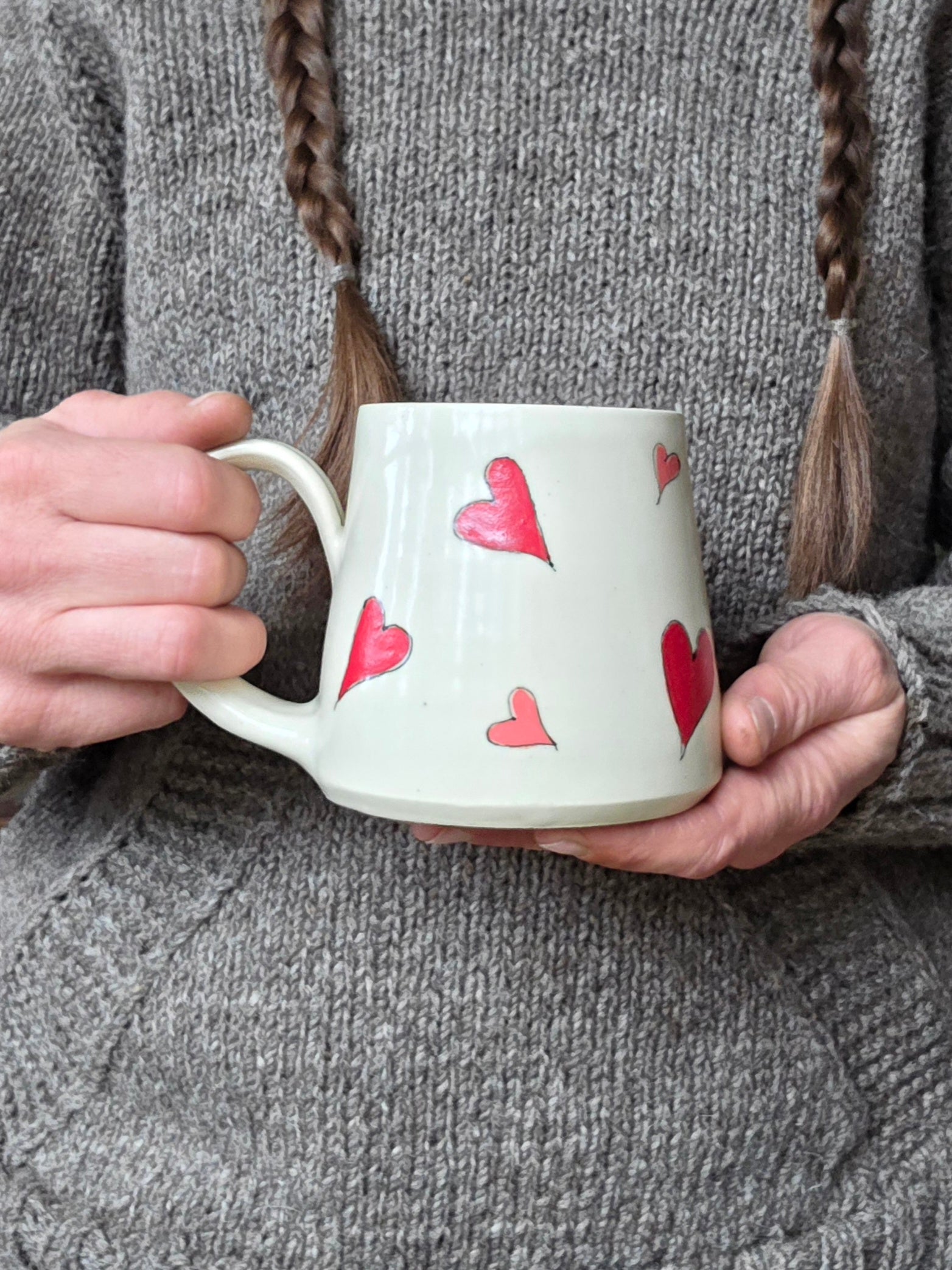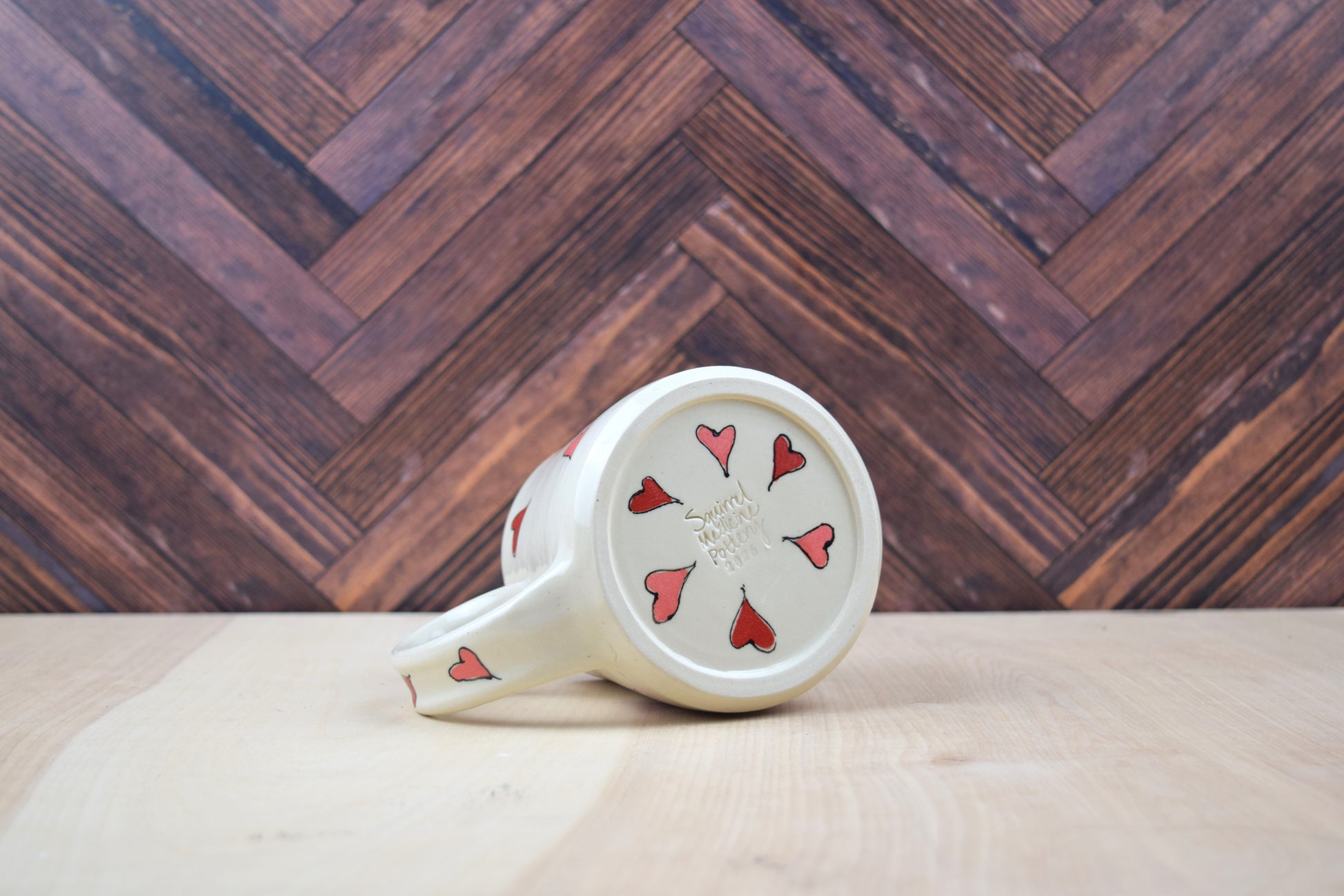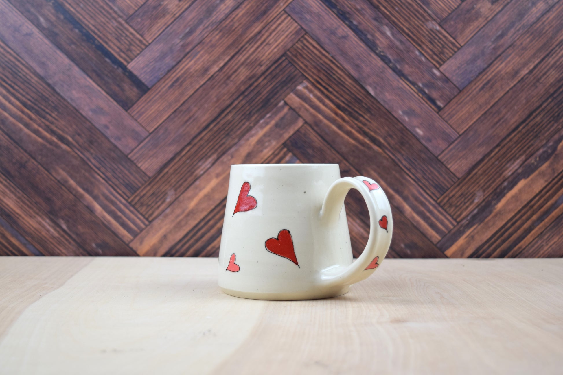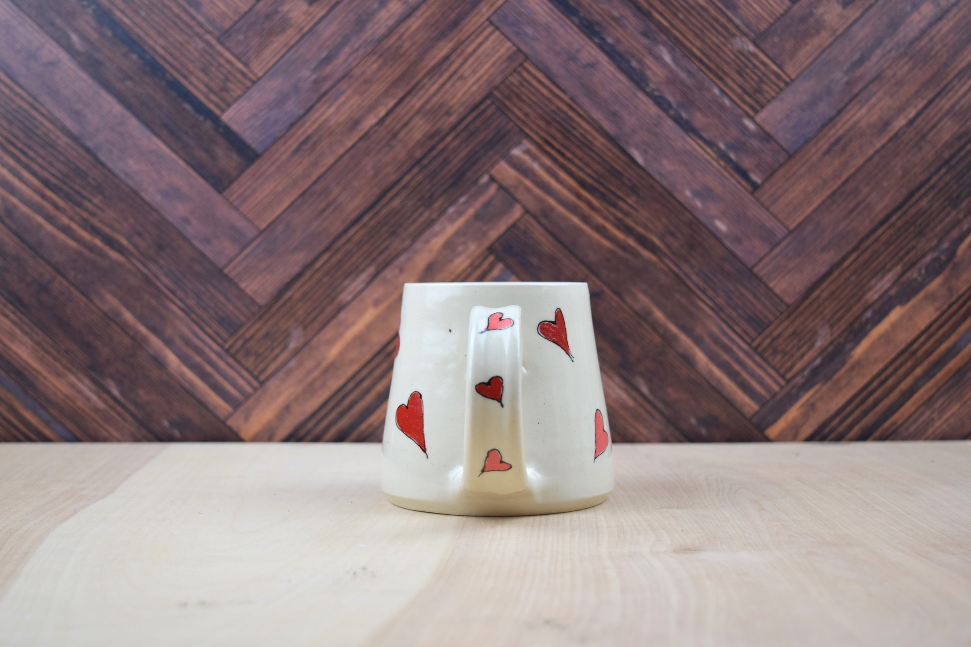 This mug holds approximately 16 ounces and is covered in hand painted hearts and glazed clear.