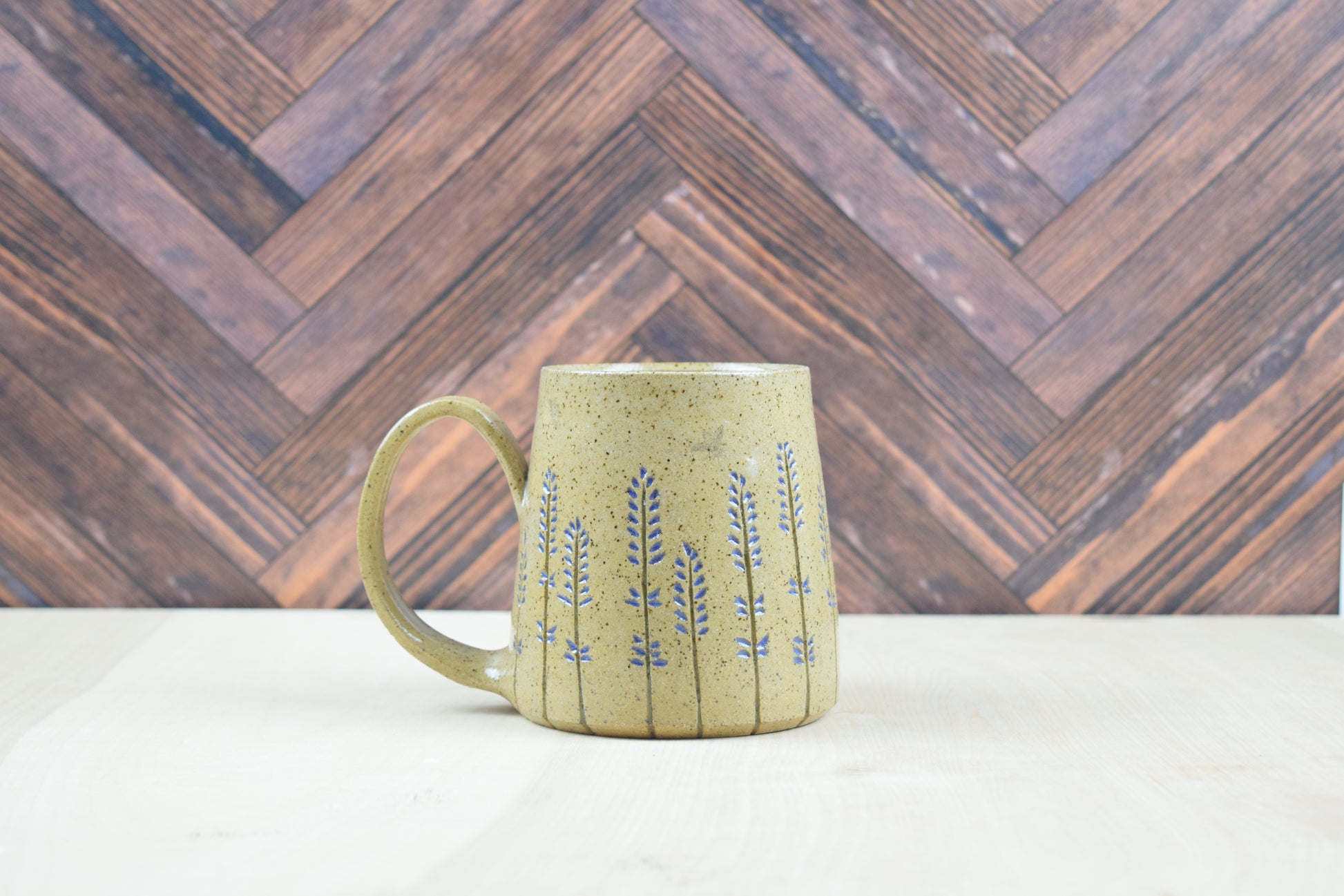This mug holds approximately 18 ounces. The lavender plants are hand carved and each petal and stem is individually painted/glazed.