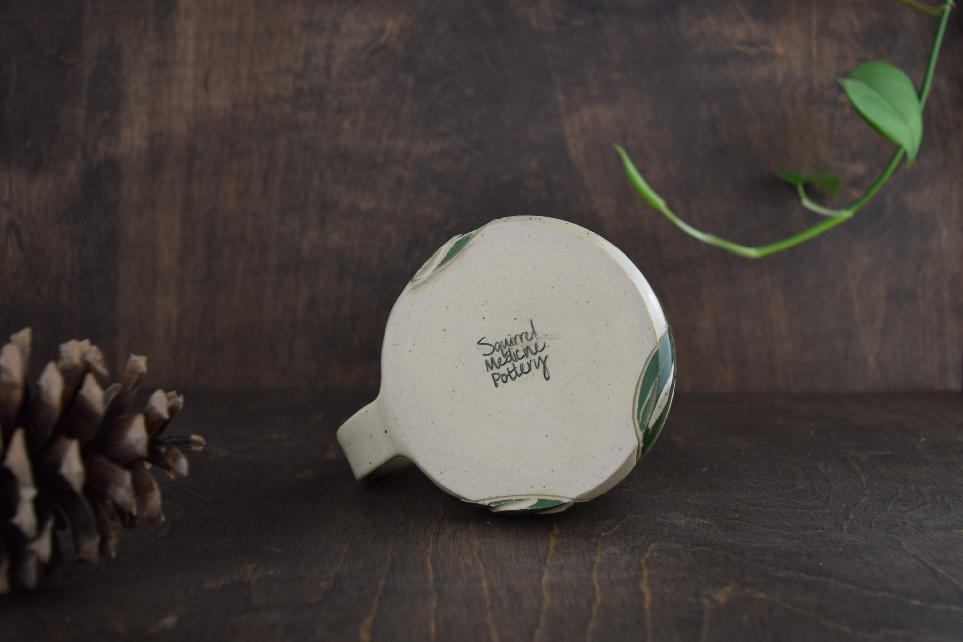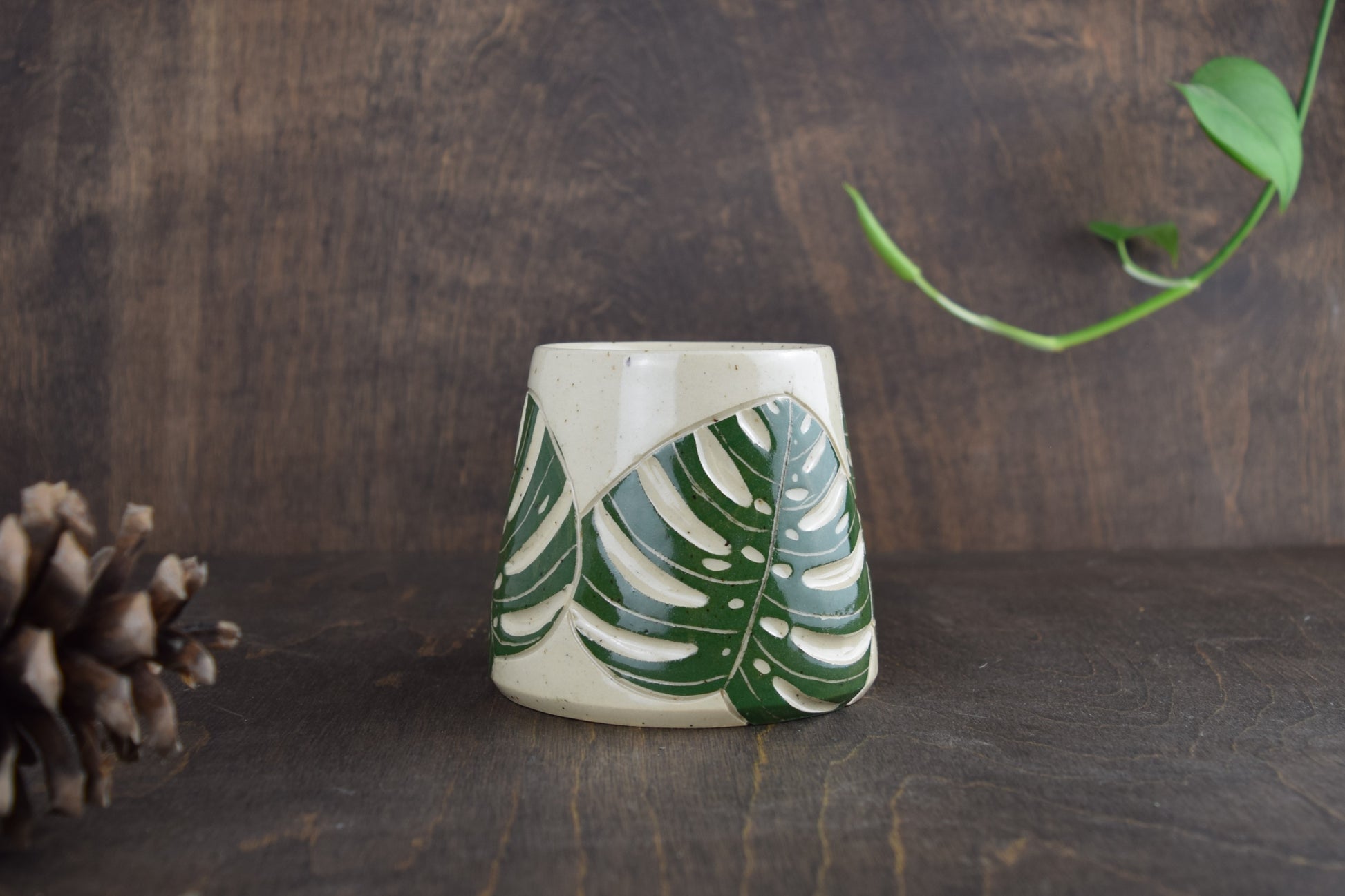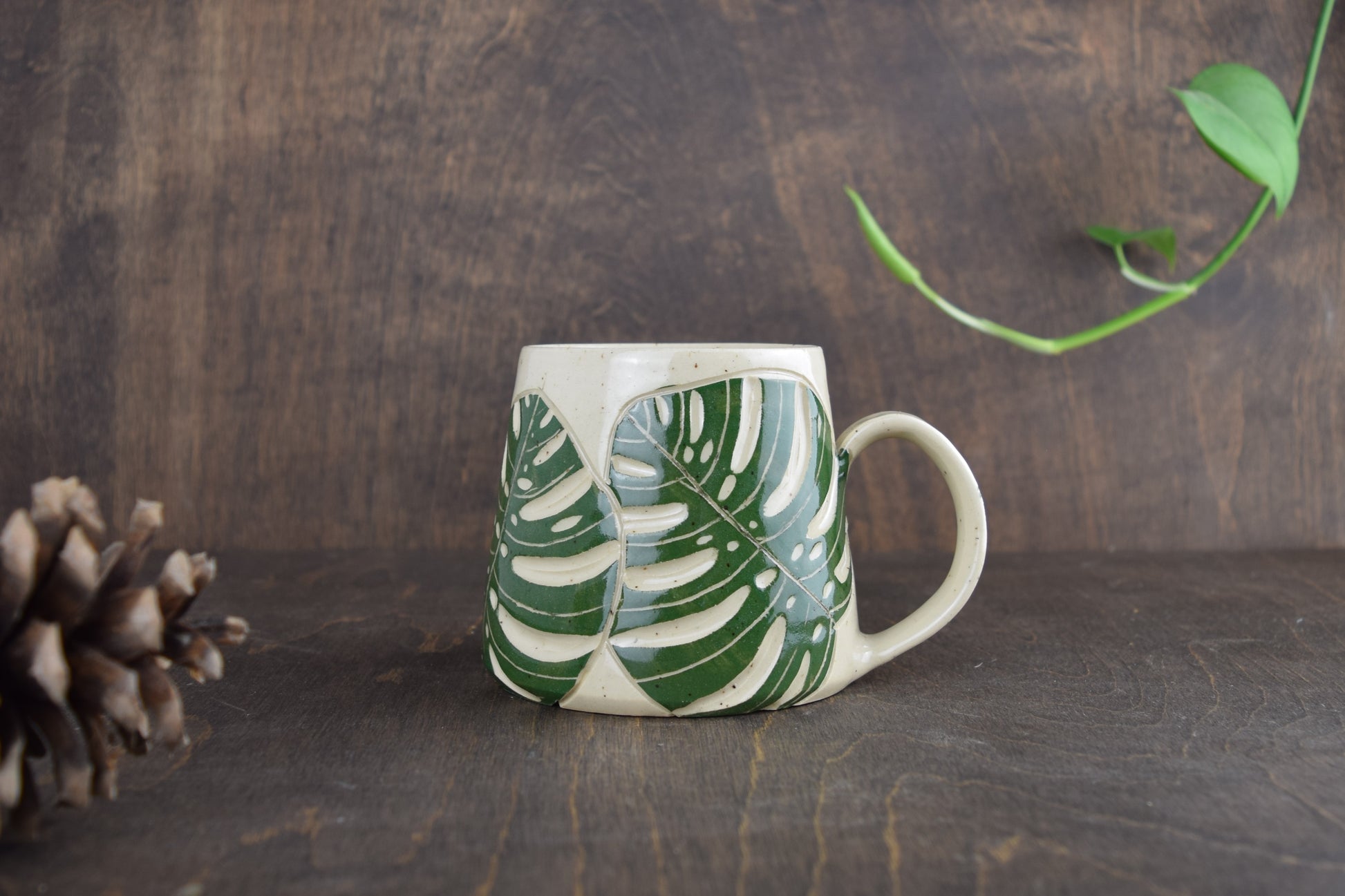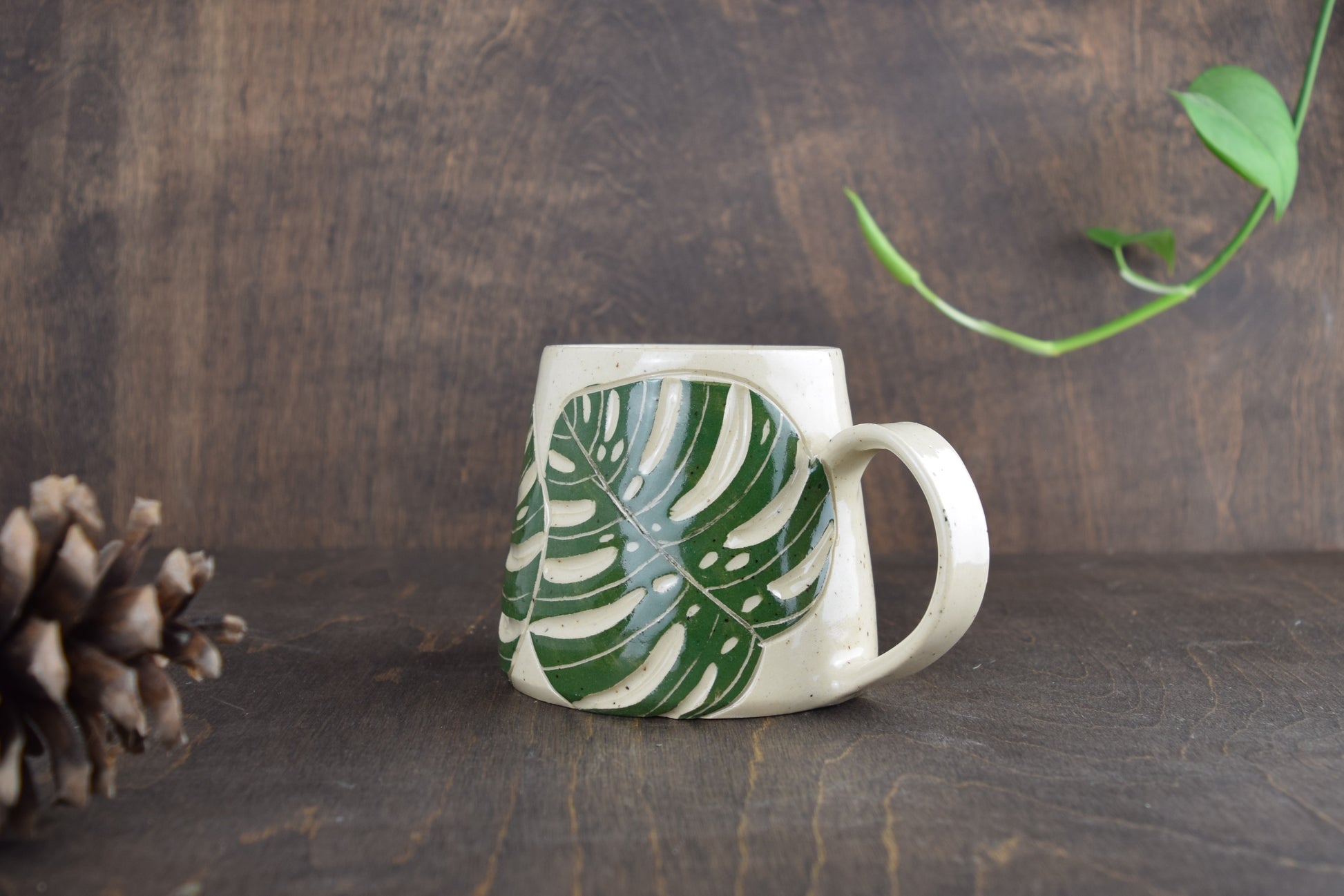 Hand painted and carved monstera leaves adorn this speckled off-white 16 ounce mug.