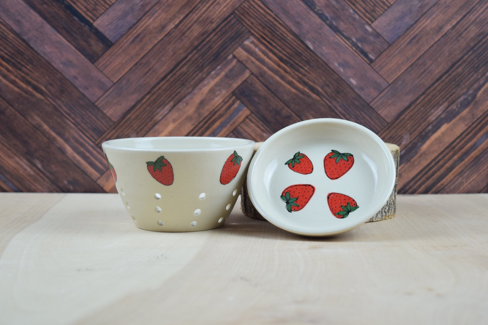 The perfect berry strainer! Complete with saucer. This set has hand painted strawberries and is covered in a clear glaze.