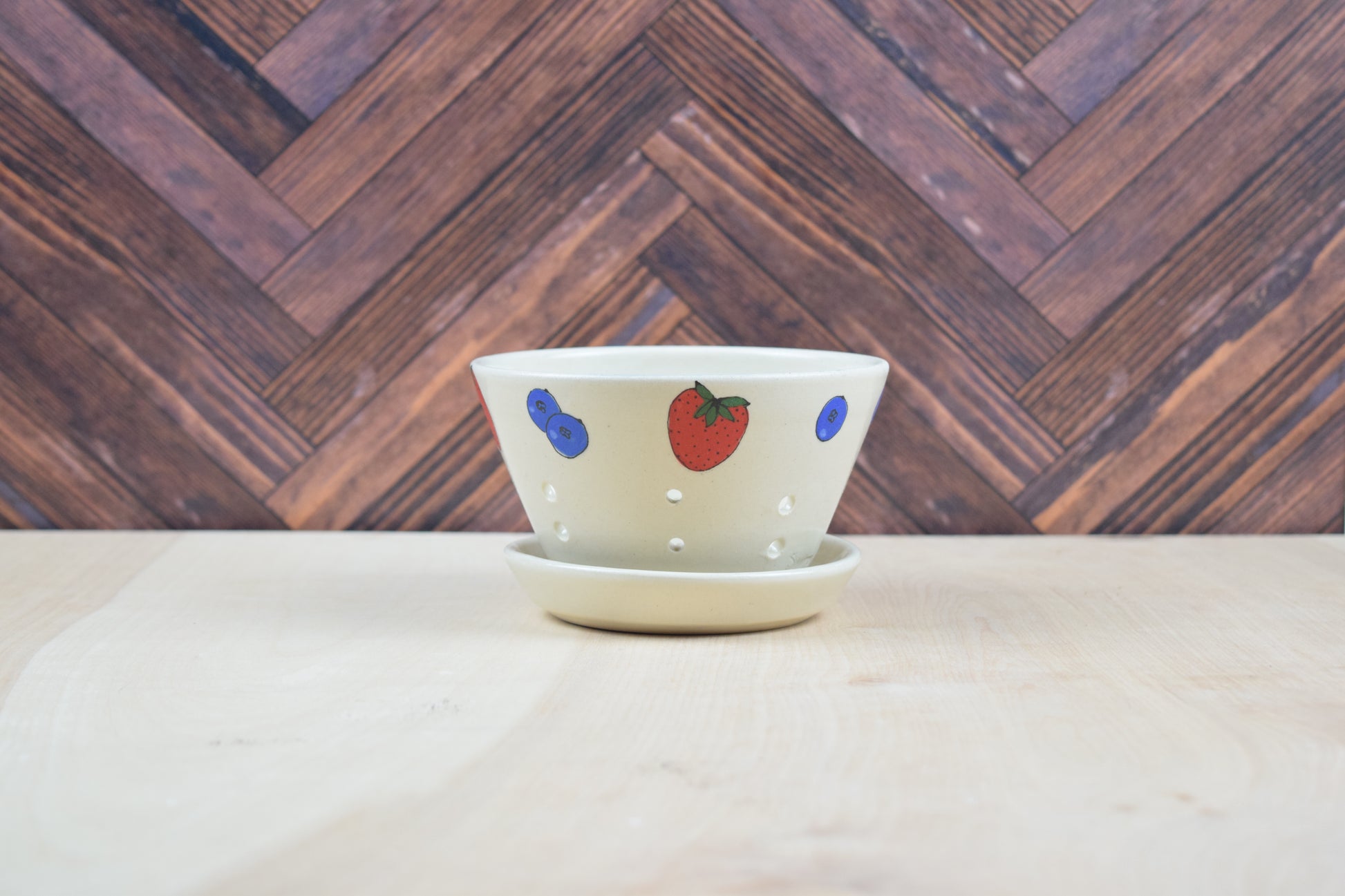 The perfect berry strainer! Complete with saucer. This set has hand painted strawberries and blueberries and is covered in a clear glaze.