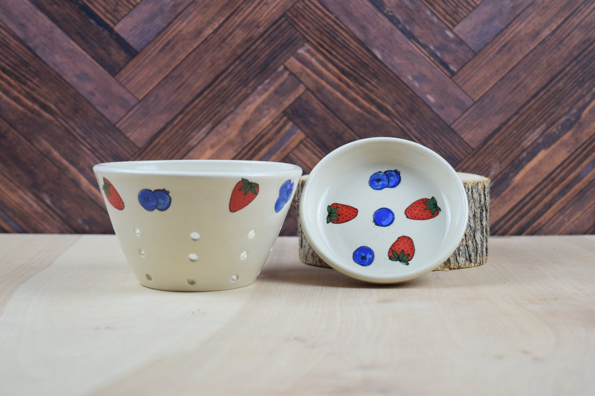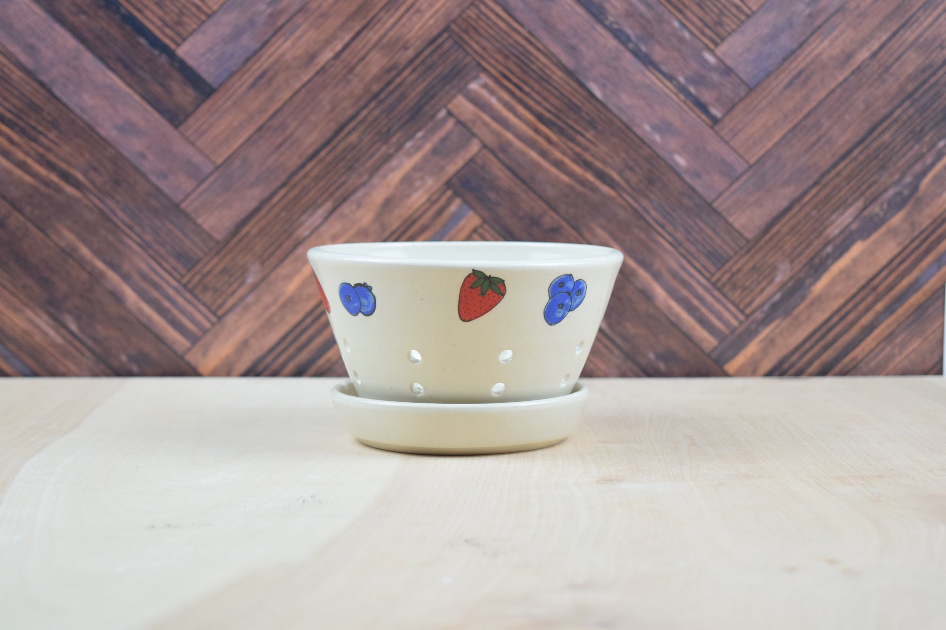 The perfect berry strainer! Complete with saucer. This set has hand painted strawberries and blueberries and is covered in a clear glaze.